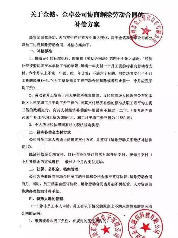 據(jù)金立方面回復(fù),東莞工廠的人員調(diào)整已經(jīng)和東莞勞動局溝通,與員工溝通一致,協(xié)商解除勞動合同,經(jīng)濟補償標(biāo)準(zhǔn)嚴(yán)格按照勞動合同法操作,對于不愿意接受協(xié)商解除勞動合同的員工,按公司停工放休政策執(zhí)行。