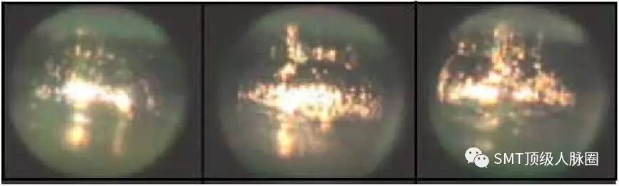 芯片離板的高度與開始時的高度相比,減小了1/3?1/2,如圖9所示。從上面描述的^BGA、CSP在再流焊接中所發(fā)生的物理化學過程可知,冷焊焊點的形成幾乎都是在再流焊接的B階段時因加熱熱量補充不足。未能達到峰值溫度便結(jié)束了再流焊接過程而形成的。因此當采用微光學視覺系統(tǒng)檢查^BGA、CSP焊點的質(zhì)量時,便可以根據(jù)焊球表面橘皮狀的程度和坍塌高度,來判斷冷焊發(fā)生的程度。