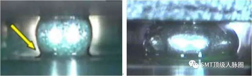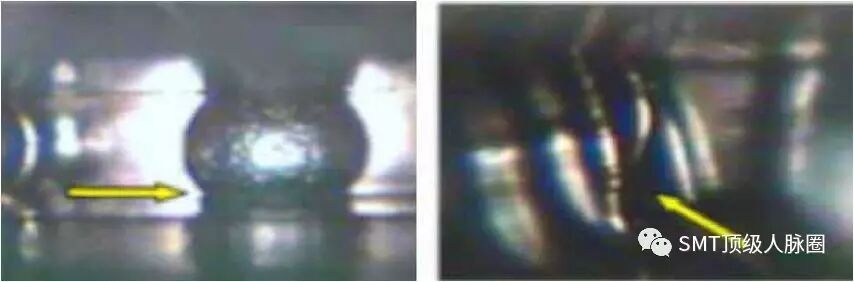 球狀焊點(diǎn)表面光亮平滑,潤(rùn)濕角良好,坍塌高度約為球狀引腳高度的(1/3?