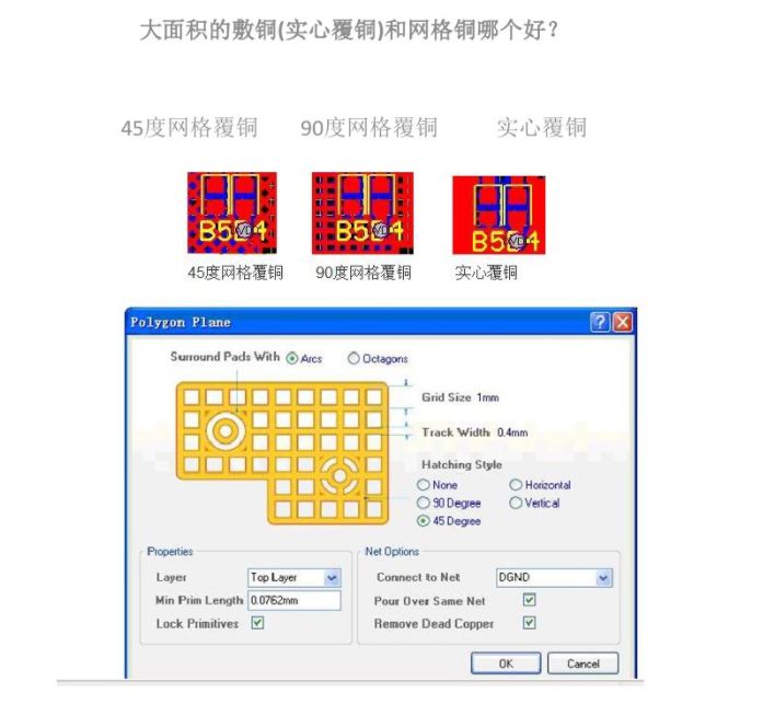 敷銅的主要目的是提高電路的抗干擾能力,同時(shí)對于PCB散熱和PCB的強(qiáng)度有很大好處,敷銅接地又能起到屏蔽的作用。但是不能使用大面積條狀銅箔,因?yàn)樵赑CB的使用中時(shí)間太長時(shí)會產(chǎn)生較大熱量,此時(shí)條狀銅箔容易發(fā)生膨脹和脫落現(xiàn)象,因此,在敷銅時(shí)最好采用柵格狀銅箔,并將此柵格與電路的接地網(wǎng)絡(luò)連通,這樣?xùn)鸥駥休^好的屏蔽效果,柵格網(wǎng)的尺寸由所要重點(diǎn)屏蔽的干擾頻率而定。